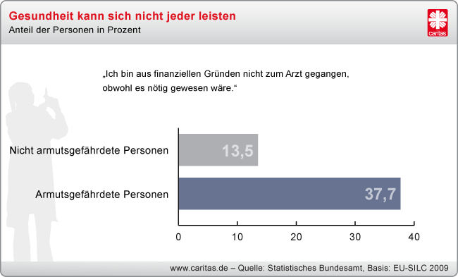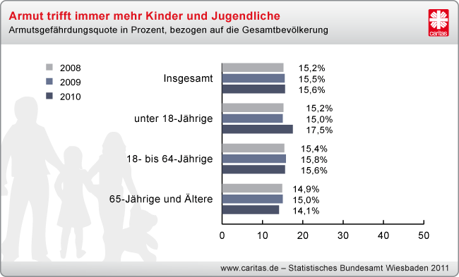 Nach den Kriterien der Europäischen Union gilt als armutsgefährdet, wer weniger als 60 Prozent des mittleren Einkommens der gesamten Bevölkerung zur Verfügung hat. Diese "Armutsrisikoschwelle" lag im Jahr 2009 für einen Alleinstehenden bei 940 Euro monatlich, für einen Haushalt mit zwei Erwachsenen und zwei Kindern unter 14 Jahren bei 1.974 Euro. Im Jahr 2009 lagen 15,6 Prozent der Gesamtbevölkerung in Deutschland unter dieser Schwelle. Aktuellere Zahlen liegen noch nicht vor.