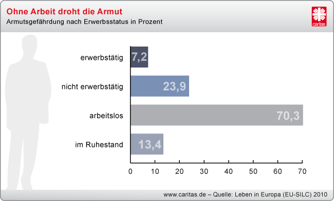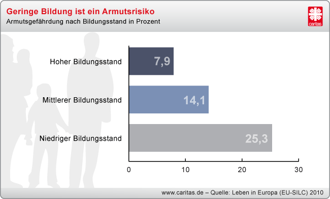 Besonders häufig von Armut bedroht sind Langzeitarbeitslose. Sieben von zehn tauchen in der Armutsstatistik auf. Auch die Zunahme schlecht bezahlter Jobs im Niedriglohnbereich führen immer mehr Menschen in Armut. Bei Alleinerziehenden mit Kindern bis drei Jahren liegt das Armutsrisiko über 50 Prozent. Bei Menschen mit niedriger Schulbildung und ohne berufliche Ausbildung lebt jeder vierte an oder unter der Armutsgrenze.