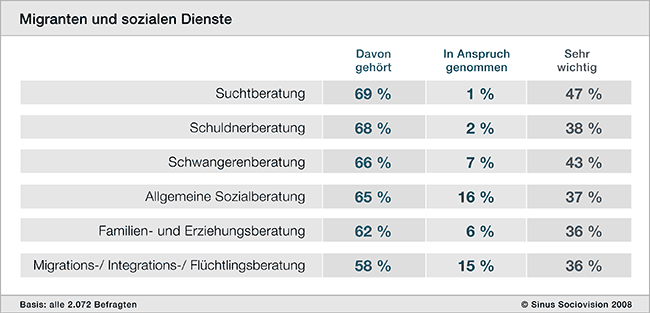 Den höchsten Bekanntheitsgrad sozialer Dienste hat unter den Migranten und ihren Kindern das Deutsche Rote Kreuz mit 92 Prozent. Danach folgen Kirche mit 78 und die Caritas mit 67 Prozent. Acht Prozent der Befragten nutzen die Dienste der Caritas. Allerdings erreicht das Hilfsangebot nicht alle Milieus gleichermaßen - obwohl die sozialen Notlagen in diesen Milieus durchaus vorhanden sind.