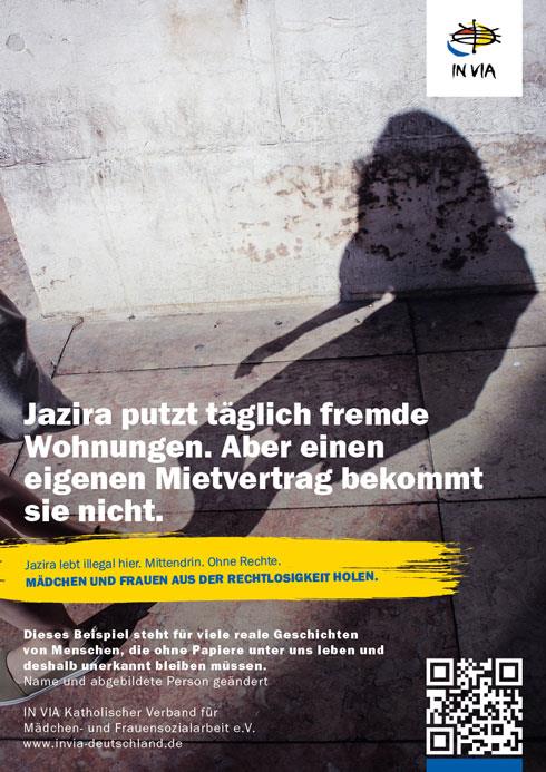 "Mittendrin. Ohne Rechte" will ein breites Bewusstsein für die Nöte dieser Frauen schaffen. Die Situation der Frauen wird in vier Kampagnenmotiven dargestellt.