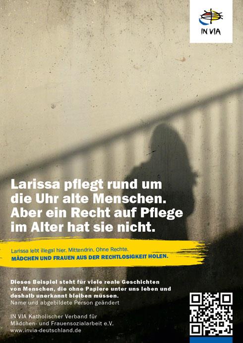 IN VIA fordert darum die Legalisierung ihres Aufenthaltes, vor allem für Frauen, die schon länger in Deutschland leben. Zudem bedarf es weiterer Angebote und rechtlicher Rahmenbedingungen, um die Menschenwürde der Frauen angemessen zu gewährleisten.