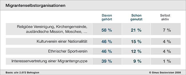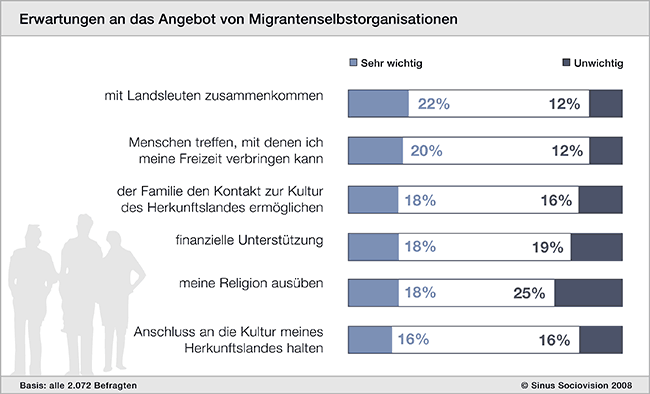 Im Auftrag des Deutschen Caritasverbandes ermittelte Sinus Sociovision, welche Rolle diese Organisationen bei Menschen mit Migrationshintergrund spielen und wie ihre Potentiale für die Integrationsarbeit genutzt werden können. Am meisten genutzt werden religiöse Vereine, Kulturvereine, ethnische Sportvereine, Interessenvertretungen einer Herkunftsgruppe oder Heimatvereine. Die meisten suchen dort Geselligkeit mit Landsleuten. Nicht ganz unwichtig ist für einige aber auch die Hoffnung auf finanzielle Unterstützung in Notlagen.