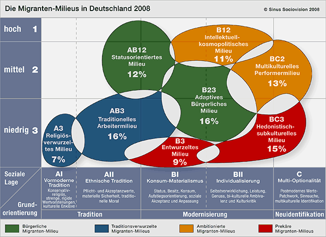 Die in Deutschland lebenden Menschen mit Migrationshintergrund sind so unterschiedlich und facettenreich wie die einheimische Bevölkerung. Die Sinus-Studie gruppiert sie in acht Milieus. Diese setzen sich aus Menschen unterschiedlicher Nationalitäten, Religionen und Herkunftskulturen zusammen. Was sie verbindet, sind ähnliche soziale Lagen, ähnliche Denkweisen und ähnliche Lebensstile. Auffallend ist: Keines der acht Milieus wird von nur einer Herkunftsgruppe bestimmt.