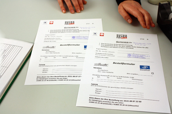 Der Deutsche Caritasverband und der Zentralverband der Augenoptiker hatten in Kooperation mit dem Caritasverband für das Erzbistum Berlin und 54 Berliner Optikergeschäften vom 15. Oktober bis zum 30. November 2012 knapp 3.000 kostenlose Brillen an bedürftige Menschen in Berlin verteilt. Mit der Aktion "Gutes Sehen für Alle" wollen sie darauf aufmerksam machen, dass Menschen, die eine Brille brauchen und von Hartz IV leben, oftmals im Nachteil sind. Arme Menschen in Deutschland haben häufig keine ausreichende Sehversorgung. Die Krankenkasse übernimmt die Kosten einer Brille bei Erwachsenen nur, wenn beide Augen nur noch eine Sehstärke von 30 Prozent haben oder mindestens ein Auge blind ist. Im Regelbedarf eines Erwachsenen sind für therapeutische Mittel monatlich 2,50 Euro vorgesehen. Zu wenig, um sich eine entsprechende Brille anfertigen zu lassen.