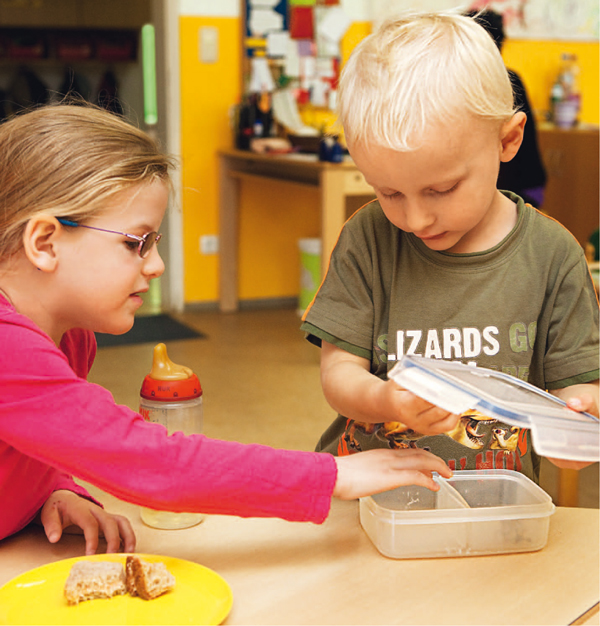 Als Nächstes steht das Geburtstagsherz auf dem Programm. In der Mitte des Kreises liegt ein großes, aus einem roten Tuch gefaltetes Herz auf dem Boden. Simon bekommt die Augen verbunden und während Musik erklingt, schmücken die anderen Kinder Simons Geburtstagsherz mit bunten Materialien wie Muscheln und Perlen. Steffi und Sophia nehmen Simons Hände und hören ganz entspannt der Musik zu. Hannes hält es nicht mehr auf dem Stuhl, er rutscht zu einer Erzieherin auf den Schoß und nach kurzer Zeit verlassen sie den Raum. Anna wird von einer Erzieherin unterstützt, damit auch sie ein paar bunte Holzstäbe auf das Herz legen kann. Schließlich ist aus dem roten Tuch ein kleines Kunstwerk geworden, das mit dem Geburtstagskind zusammen auf einem Foto festgehalten wird. Nach einem kurzen Fingerspiel ist das Geburtstagsritual beendet und die Kinder stürmen in den Garten.