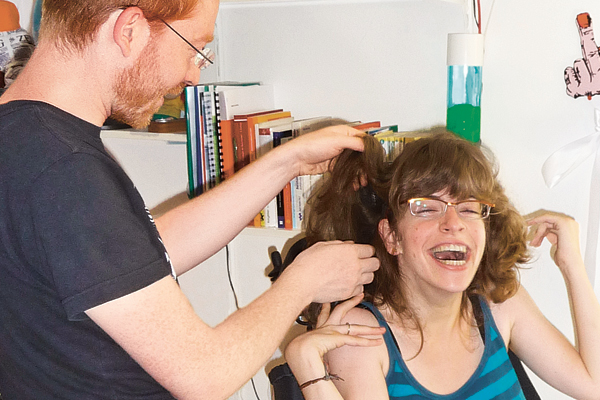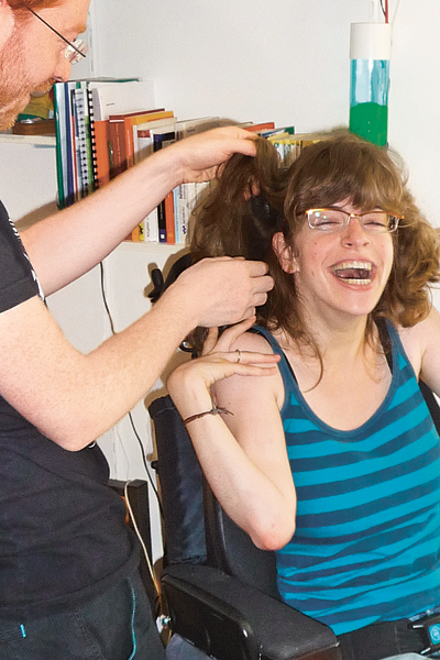 Obwohl Kathrin die Förderschule besuchte, war es ihr fester Wille, einmal Abitur zu machen. Ich war fasziniert, habe aber gedacht: "Träum’ schön weiter, mit solch einer Behinderung, wie soll das gehen?" - Jetzt, 15 Jahre später, treffe ich Kathrin Lemler in einer Wohnung im Studentenheim in Köln. Sie studiert Pädagogik mit Schwerpunkt Rehabilitation an der Universität. Vor wenigen Wochen hatte sie einen Preis der Aktion Mensch erhalten - einen Reisegutschein. So konnte sie sich den Traum, nach New York zu fliegen, erfüllen - zusammen mit ihrem Freund. Auf die Frage, ob dieser auch eine Behinderung habe, antwortet sie: "Ja, genauso wie wir beide. Er ist Brillenträger." Ich habe Kathrin Lemler, die heute 25 Jahre alt ist, noch mehr Fragen gestellt. Ihre Antworten schrieb sie auf dem für ihre Bedürfnisse ausgebauten PC.