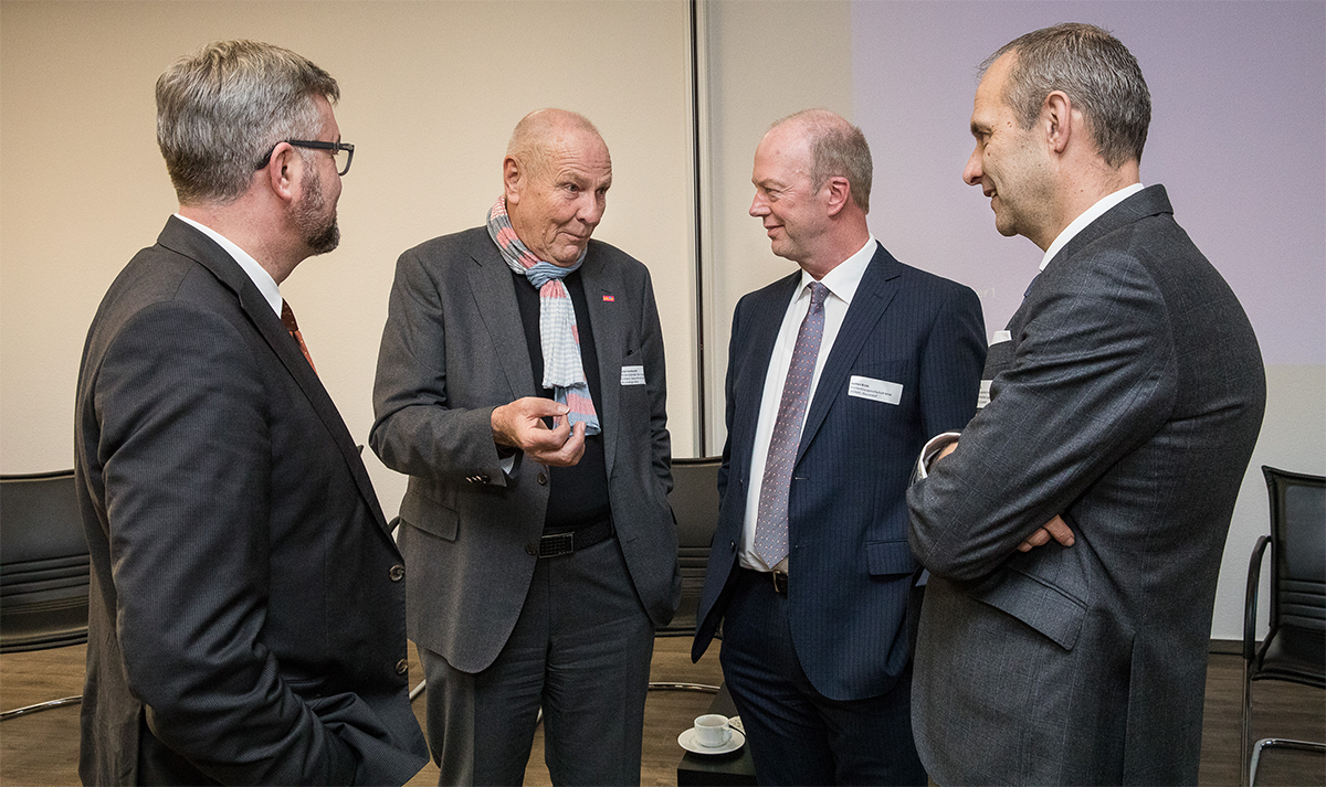 Vier Männer im Gespräch bei der Fachveranstaltung zur Krankenhausfinanzierung in Düsseldorf (Achim Pohl)