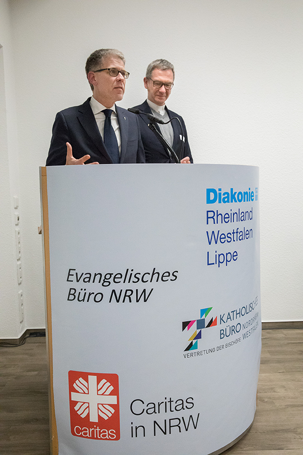 Kirchenrat Dr. Thomas Weckelmann (Evangelisches Büro NRW) und Dr. Antonius Hamers (Katholisches Büro NRW) vor dem Rednerpult (von links). (Achim Pohl)