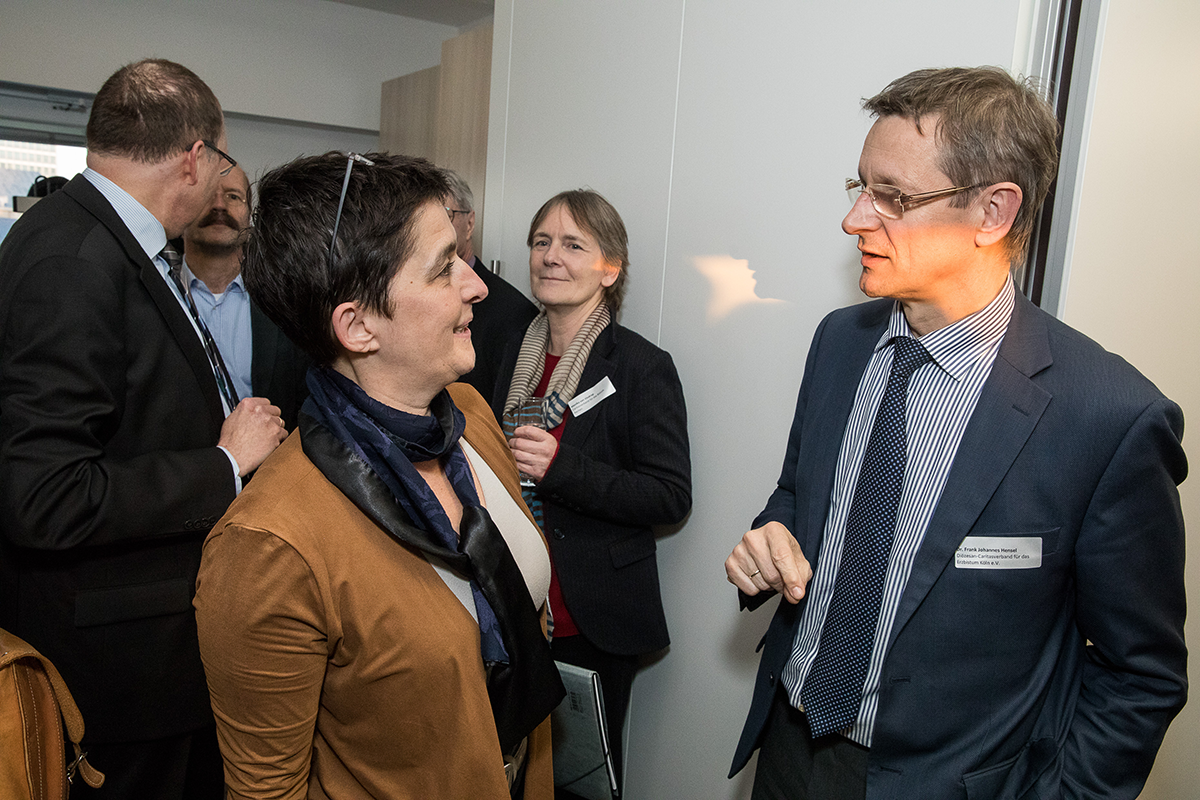NRW-Ministerin für Gesundheit, Emanzipation, Pflege und Alter Barbara Steffens im Gespräch mit dem Kölner Diözesan-Caritasdirektor Frank Johannes Hensel. Im Hintergrund sind weitere Personen zu sehen. (Achim Pohl)
