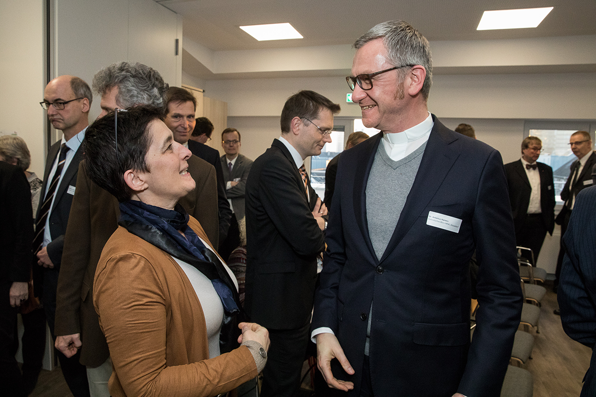 NRW-Ministerin für Gesundheit, Emanzipation, Pflege und Alter Barbara Steffens im Gespräch mit Dr. Antonius Hamers (Leiter des Katholischen Büros NRW). Im Hintergrund sind weitere Personen zu sehen. (Achim Pohl)