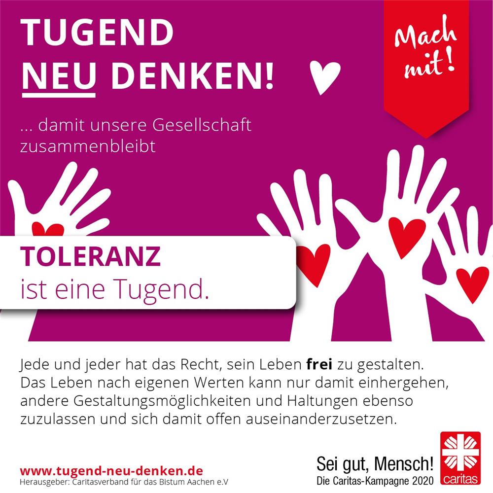 Toleranz, so wird mir deutlich, ist keine leichte Tugend. Auch wenn ich mich selbst für einen prinzipiell offenen und toleranten Menschen halte, wird Toleranz doch zu einer schwierigen Tugend, wenn sie mich etwas kostet - in diesem Fall das Eingeständnis, einen Menschen vorverurteilt zu haben. "Sei gut, Mensch" - im Sinne der Jahreskampagne der Caritas will ich mich darin üben, die Eigenheiten anderer zu akzeptieren, die Beweggründe für ihr Handeln zu verstehen und hierfür den vielleicht kritischen, aber doch friedlichen Dialog mit ihnen zu suchen.