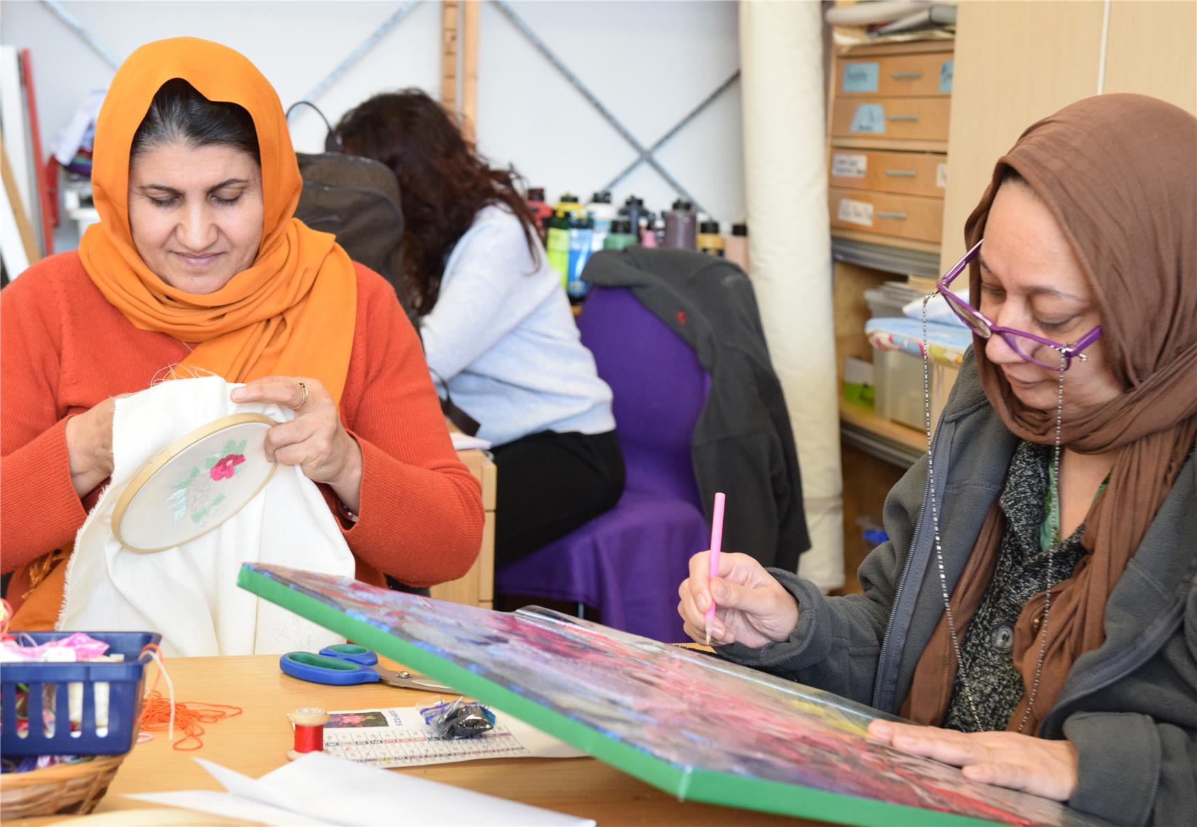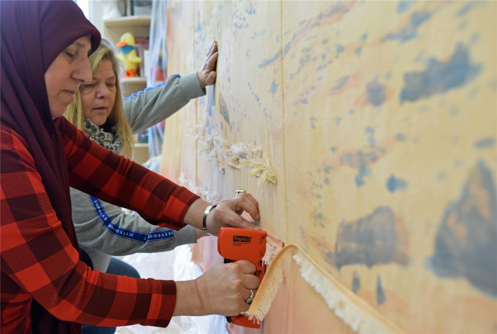 Monika von Bernuth (l.) vom Spectrum und die Künstlerin Vera Sous (r.) schauen sich einen Teil der Wüstenlandschaft an, die die Künstlerin in Kooperation mit Projektteilnehmerinnen des Spectrums auf Stoff für die Innengestaltung der Caritas-Pilgerraststätte schaffen.Thomas Hohenschue