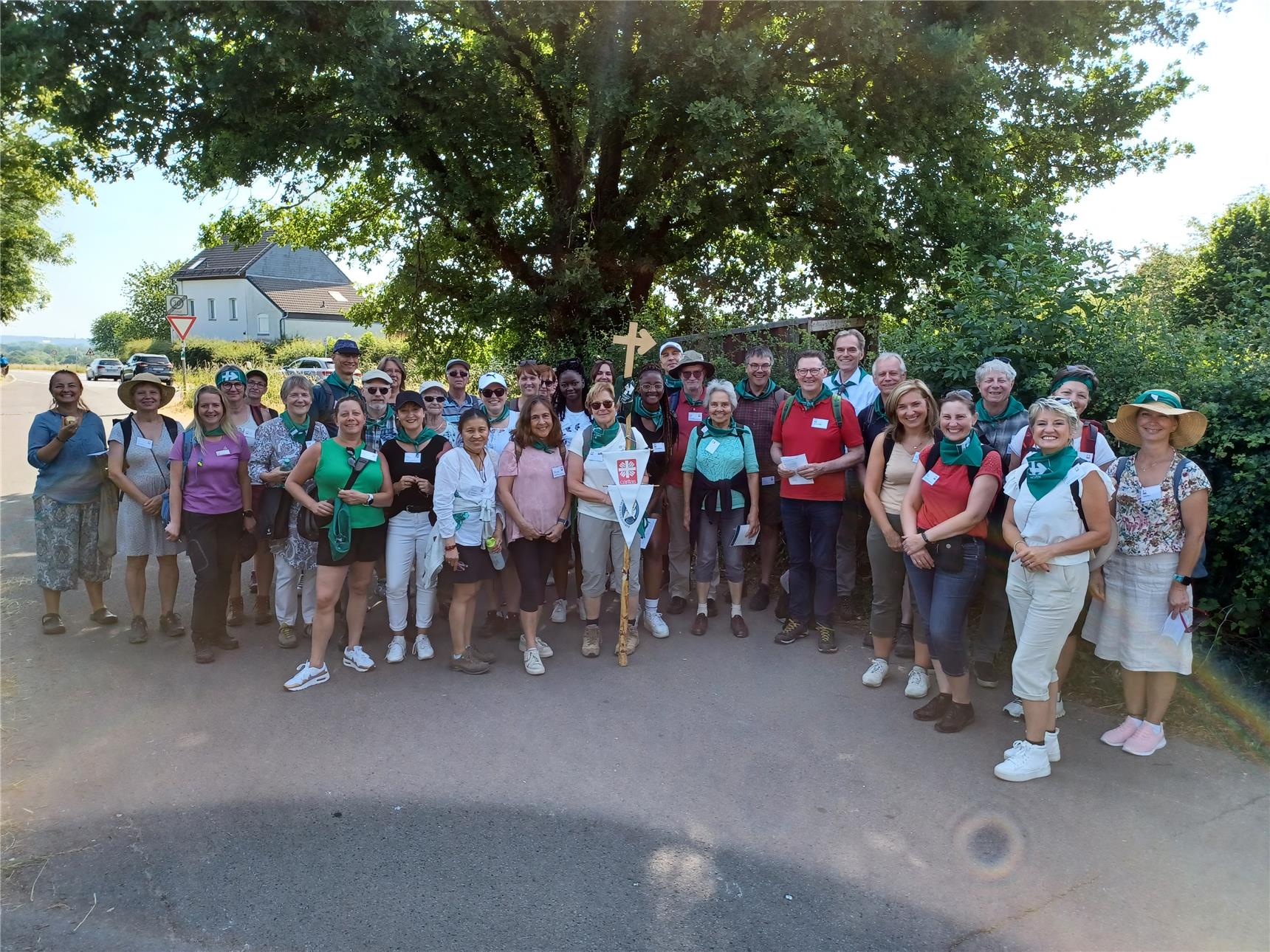 Unterwegs hielten die Pilgergruppen bei drei Stationes inne, hörten biblische Texte und Impulse, beteten und sangen miteinander. Während des Weges unterhielten sich die Pilgerinnen und Pilger, die aus unterschiedlichen Caritasverbänden kamen. Den Pilgergruppen voran wurde ein Pilgerstab mitgeführt. Der Pilgerstab, den die Gruppe mitbrachte, die von Kornelimünster aus zum Haus der Caritas an der Kapitelstraße aufbrach, hat schon mehrere Wallfahrten erlebt. 2014, als die verbandliche Caritas im Bistum erstmals bei einer Heiligtumsfahrt eine Pilgerraststätte organisierte, stand dieser Pilgerstab in der Raststätte. 2016, als sich die verbandliche Caritas aus dem Bistum Aachen zum Abschluss des Jahres der Barmherzigkeit zum Aachener Dom aufmachte, ging auch dieser Pilgerstab voran. Am Samstag nun stand der Pilgerstab im Garten des Hauses inmitten der Pilgergruppen, als sie gemeinsam Wortgottesdienst feierten.