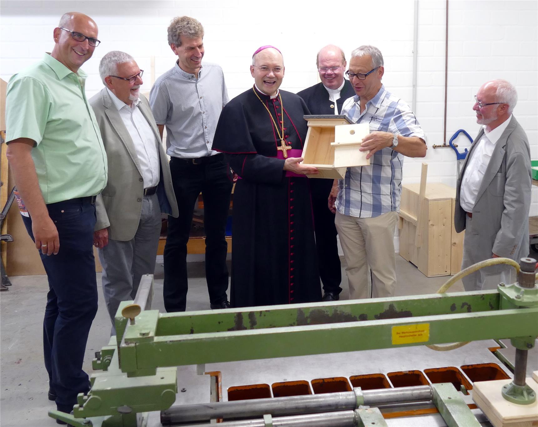 Nachdem Bischof Dr. Helmut Dieser am Sonntag das Vitusfest im und ums Gladbacher Münster besucht hat kam er auch erstmals in den Volksverein. Gesellschafter, Beirat und Geschäftsführung des Volksvereins führten ihn durch die Räumlichkeiten auf der Geistenbecker Straße. An der Holzwerkstatt war der Bischof besonders interessiert - er erzählte, dass auch seine Eltern eine Schreinerei hatten. Auch mit den dortigen Maschinen kannte er sich gut aus. Weiter ging es durch die Rapsmühle und die Sortierhalle.