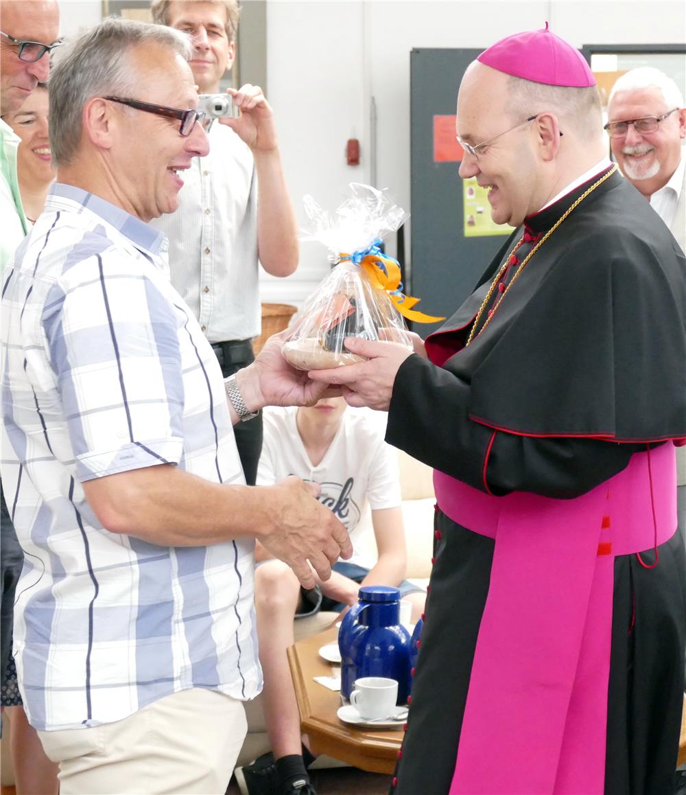 Zum Anschluss freute der Bischof sich über ein kleines Präsent aus der Produktion des Volksvereins. Er erhielt eine Menage mit dem hochwertigen Rapsöl des Volksvereins. Auch dieses kannte er schon - bei einer anderen Gelegenheit hatte er schon einmal eine Flasche geschenkt bekommen - treffend konnte er den nussigen Geschmack des Öls beschreiben.