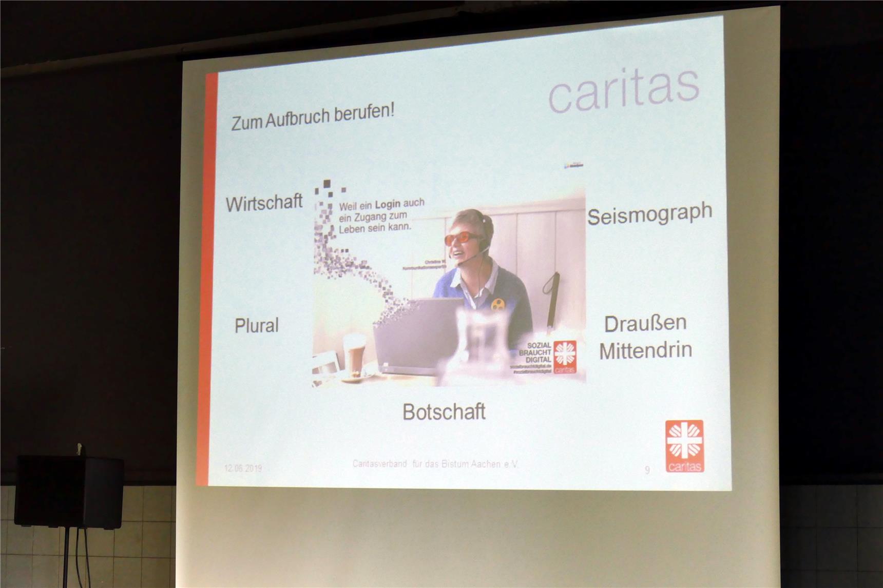 Anna Kohlwey, Fachreferentin für theologische Grundsatzfragen in der Geschäftsstelle des Caritasverbandes für das Bistum Aachen, sagte zur Einführung in das Thema, dass Kirche zum Aufbruch berufen sei. Unter diesem Vorzeichen müsse sie auch den digitalen Fortschritt betrachten. Die Digitalisierung sei aus Sicht der Kirche ein "Zeichen der Zeit", auf das die Kirche mit ihren Mitteln antworten müsse. Es gehe die dem Thema nicht darum, dem Zeitgeist nachzulaufen sondern aus Sicht der Kirche eine Orientierung anzubieten, der Menschen den Umgang mit der Digitalisierung erleichtere.