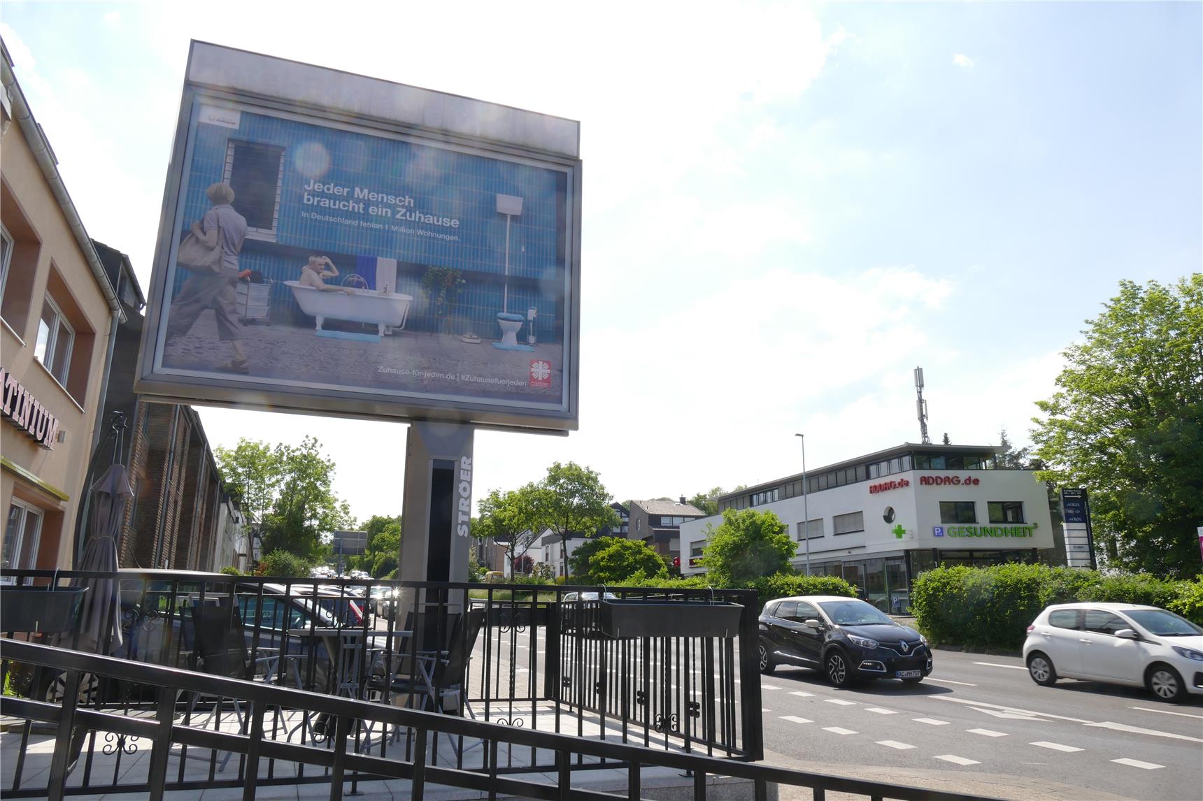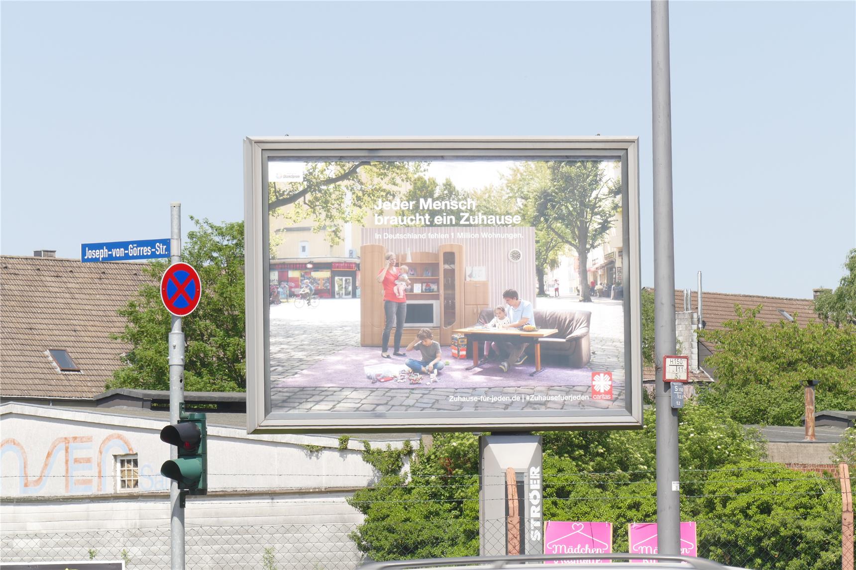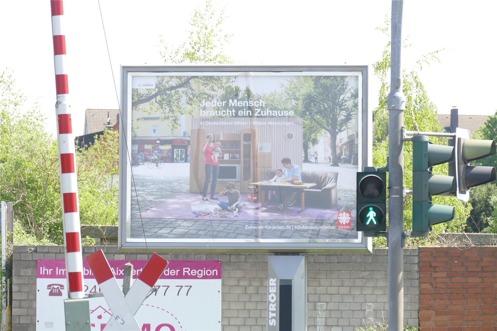 Die Plakatmotive - an den Megalights in Aachen sind alle drei Plakatmotive zu sehen - gehen von der Redensart "auf der Straße sitzen" aus. Sie zeigen eine Studentin in ihrem Studentenzimmer, eine Familie in ihrem Wohnzimmer und einen Rentner in der Badewanne - jeweils aufgebaut im öffentlichen Raum. Passanten gehen an der Szene vorbei. Die Plakate hängen nicht nur in Aachen, sondern in Nordrhein-Westfalen auch in Essen, Köln, Münster und Paderborn, in den Städten also, in denen die fünf nordrhein-westfälischen Diözesancaritasverbände ihren Sitz haben.