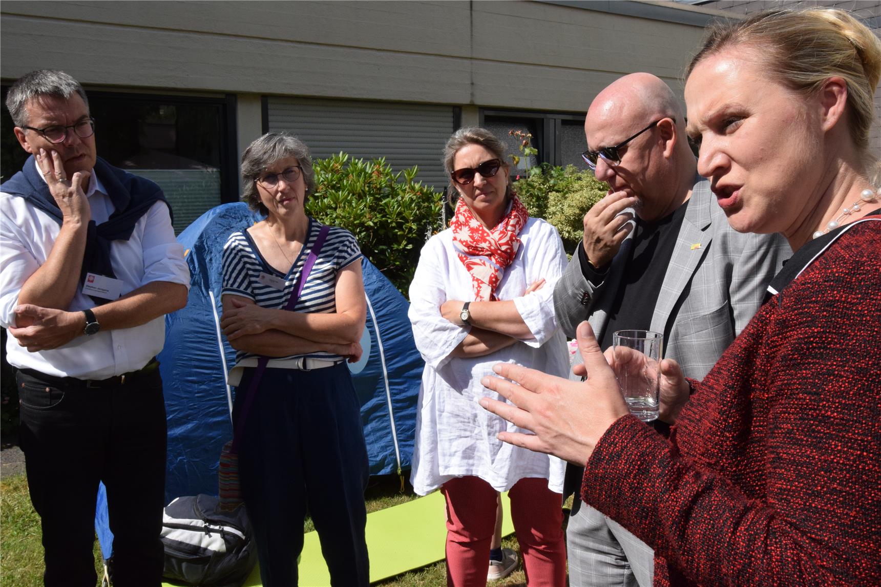 Wie schmack- und nahrhaft die täglichen Gäste des Treffs an der Waisenhausstraße versorgt werden, durften die Teilnehmenden der Sommertour dort persönlich erleben. Als Kulisse im Garten hinter dem SKM-Haus hatten Fachkräfte eine Landschaft der Wohnsituationen in Mönchengladbach aufgebaut - vom Luxushaus bis zum Schlafsack reicht diese Vielgestaltigkeit, die herausfordert.