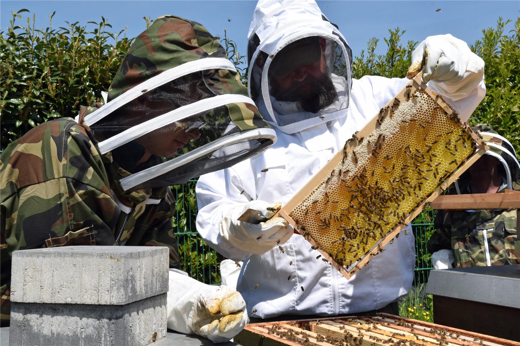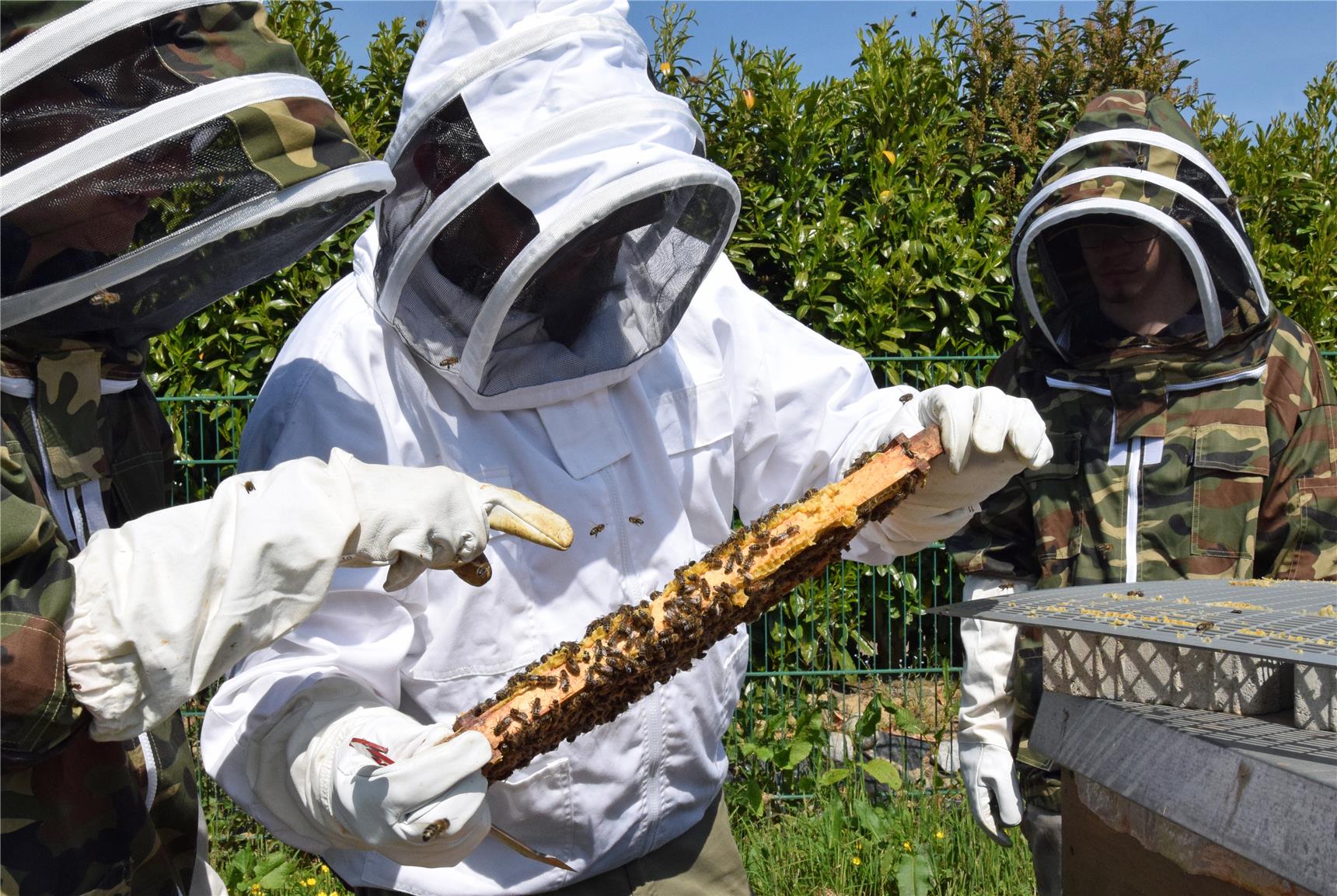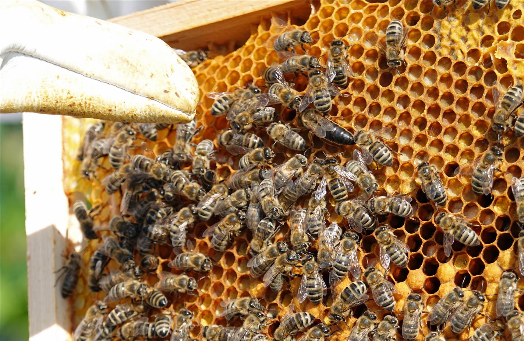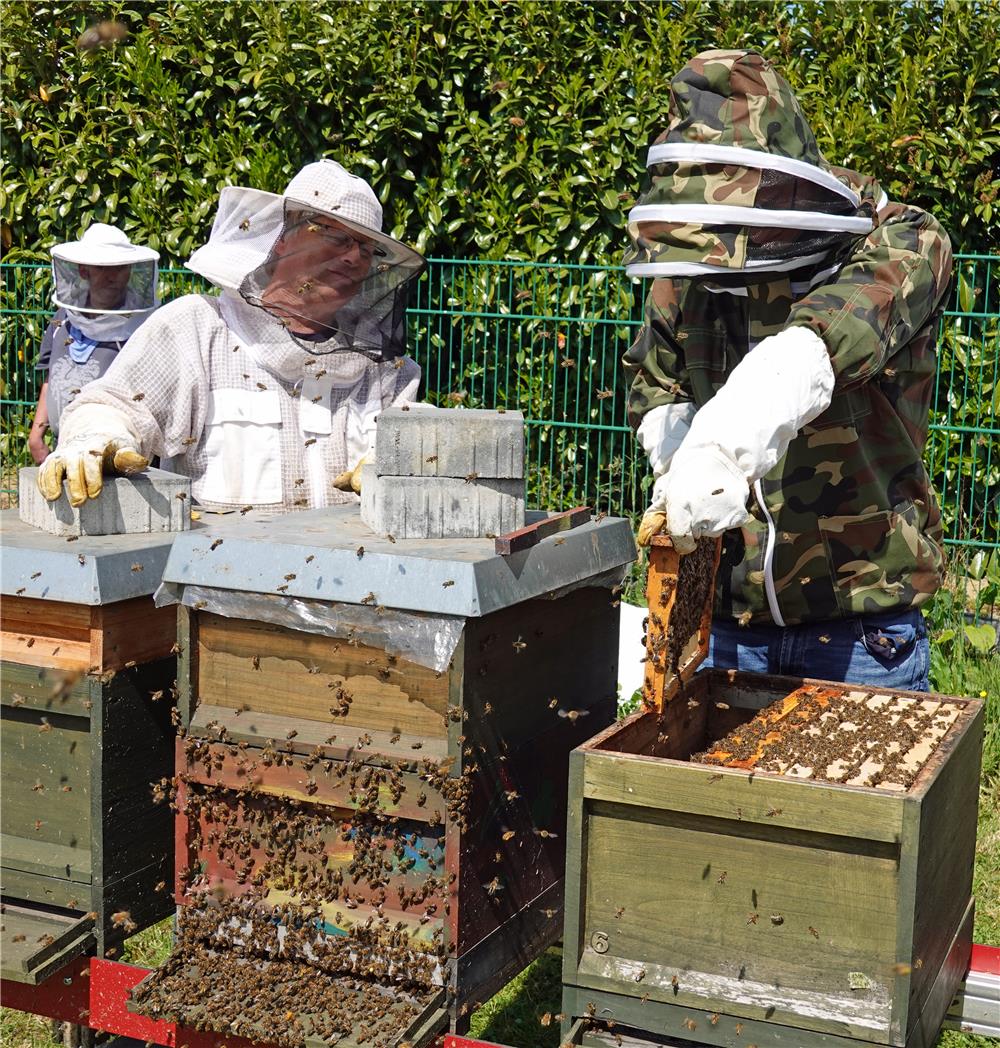 Der Metall-Gruppenleiter kann sich dem selbst nicht entziehen und hat angefangen, auch in seiner Freizeit zu imkern. Daran dürfte Imker Guido Dondorf nicht ganz unschuldig sein. Als "Fachkraft für Bienen" bringt er das nötige Know-how ein, sorgt für Sicherheit aller Beteiligten, für artgerechte Bedingungen und Betreuung der Bienenvölker und betreut alle Prozesse der Honigproduktion.