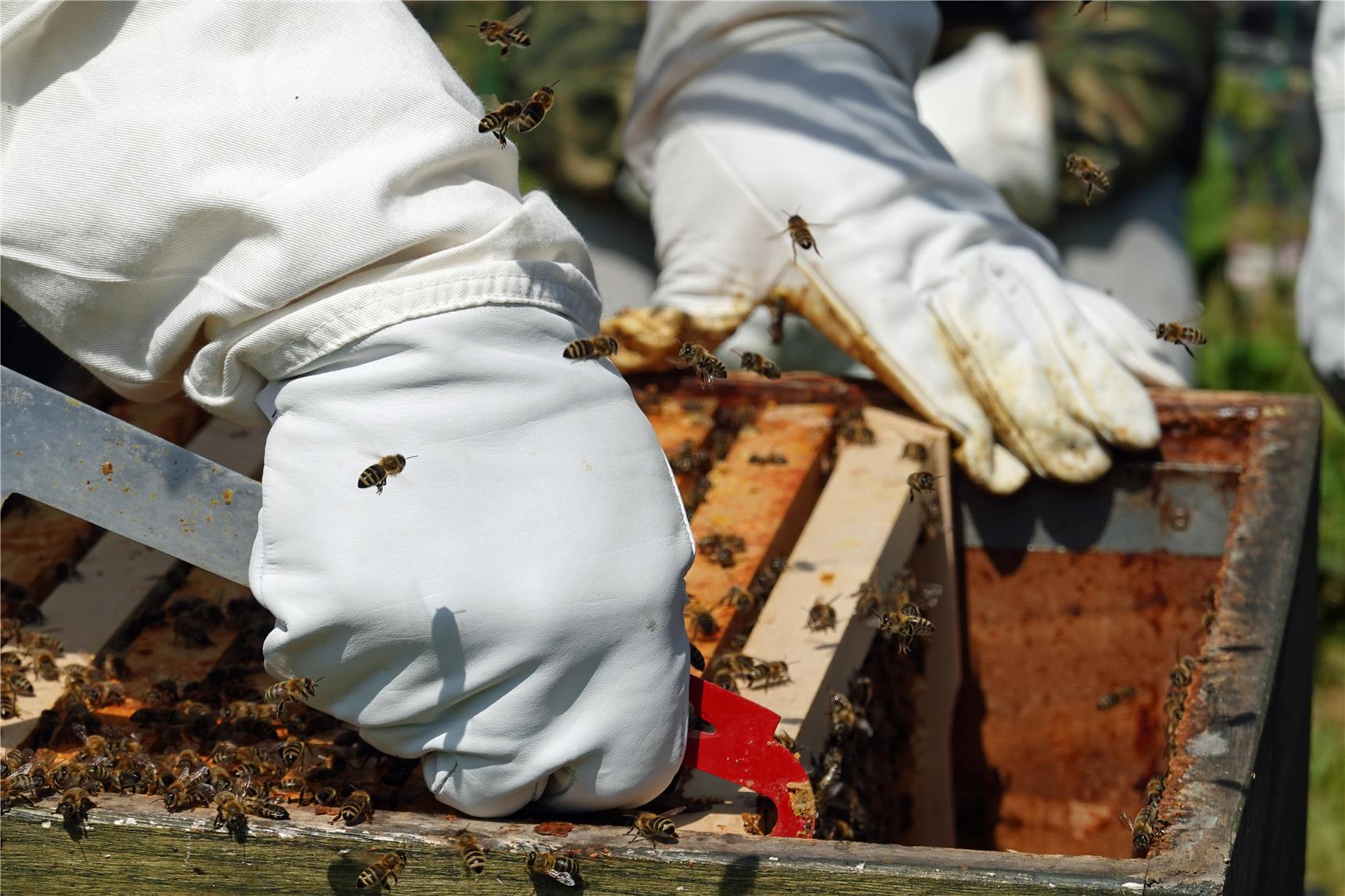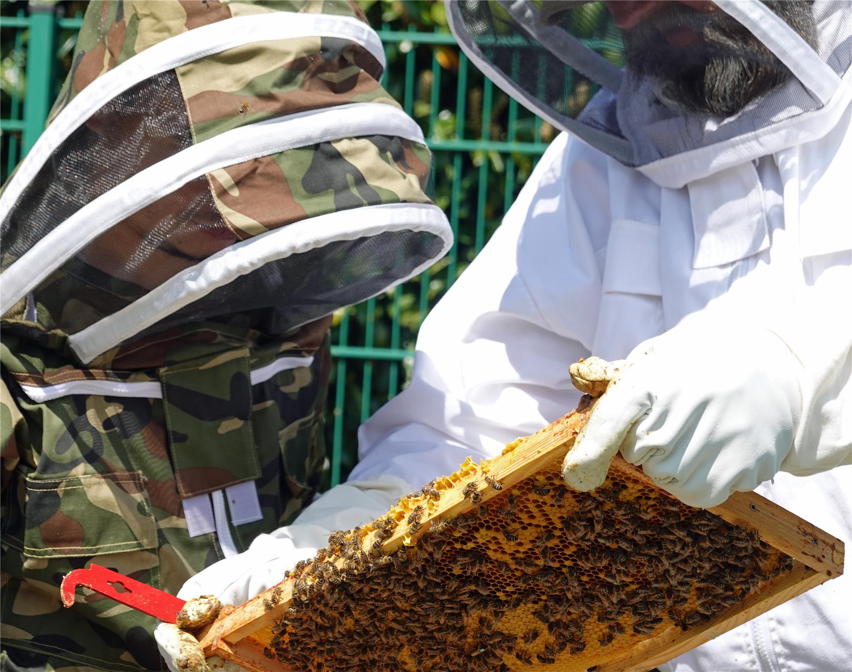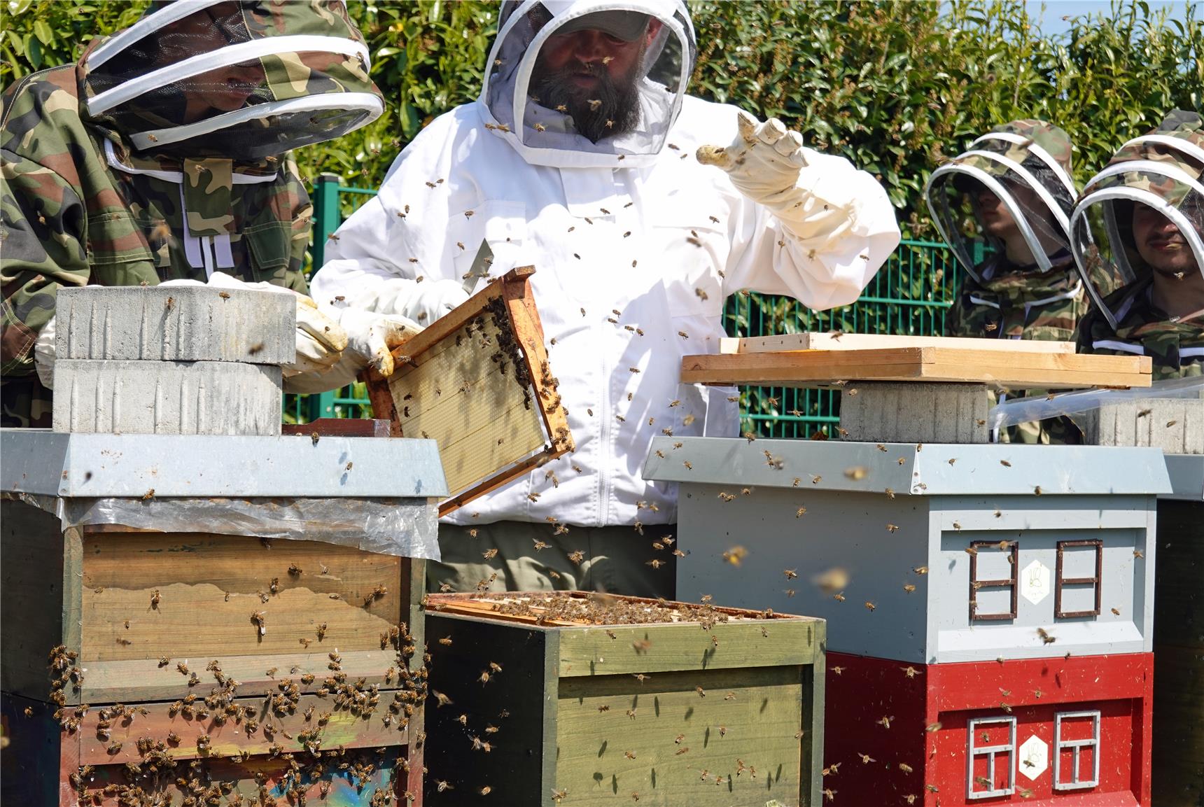 Der Metall-Gruppenleiter kann sich dem selbst nicht entziehen und hat angefangen, auch in seiner Freizeit zu imkern. Daran dürfte Imker Guido Dondorf nicht ganz unschuldig sein. Als "Fachkraft für Bienen" bringt er das nötige Know-how ein, sorgt für Sicherheit aller Beteiligten, für artgerechte Bedingungen und Betreuung der Bienenvölker und betreut alle Prozesse der Honigproduktion.