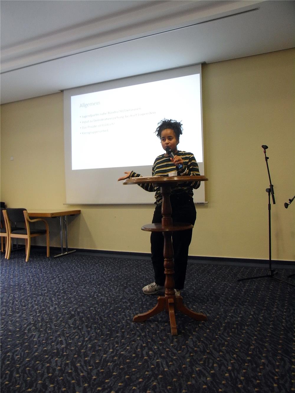 Maja Tölke, Referentin für Jugendpolitik bei der sozialistischen Jugend Deutschlands -Die Falken, stellte den Jugendverband vor, dessen Arbeitsschwerpunkte und Aufgaben im Bereich der politischen und sozialen, außerschulischen Bildung liege. Die Stärkung der demokratischen Gesellschaft durch Partizipation und Emanzipation von Kindern und Jugendlichen sei dabei vorrangiges Ziel. Die Angebotspalette reiche von Seminaren und Projektarbeit bis zu Kinder und Jugendgruppenarbeit und Zeltlagern. Alle diese Angebote seien nicht nur für Mitglieder,sondern stünden allen Interessierten zur Verfügung.