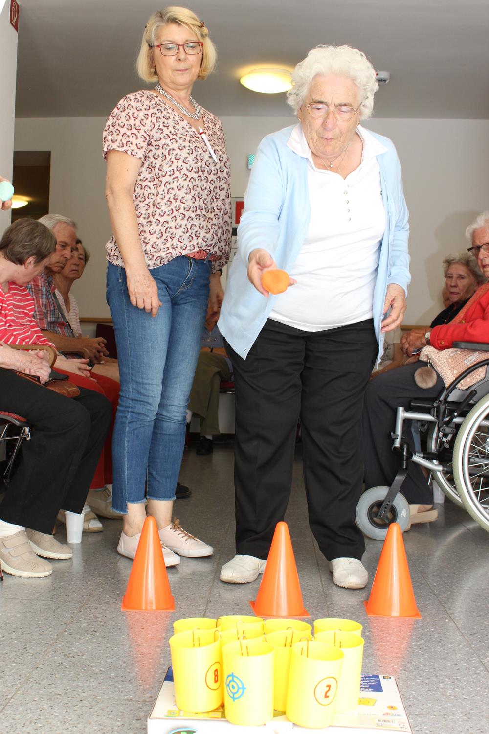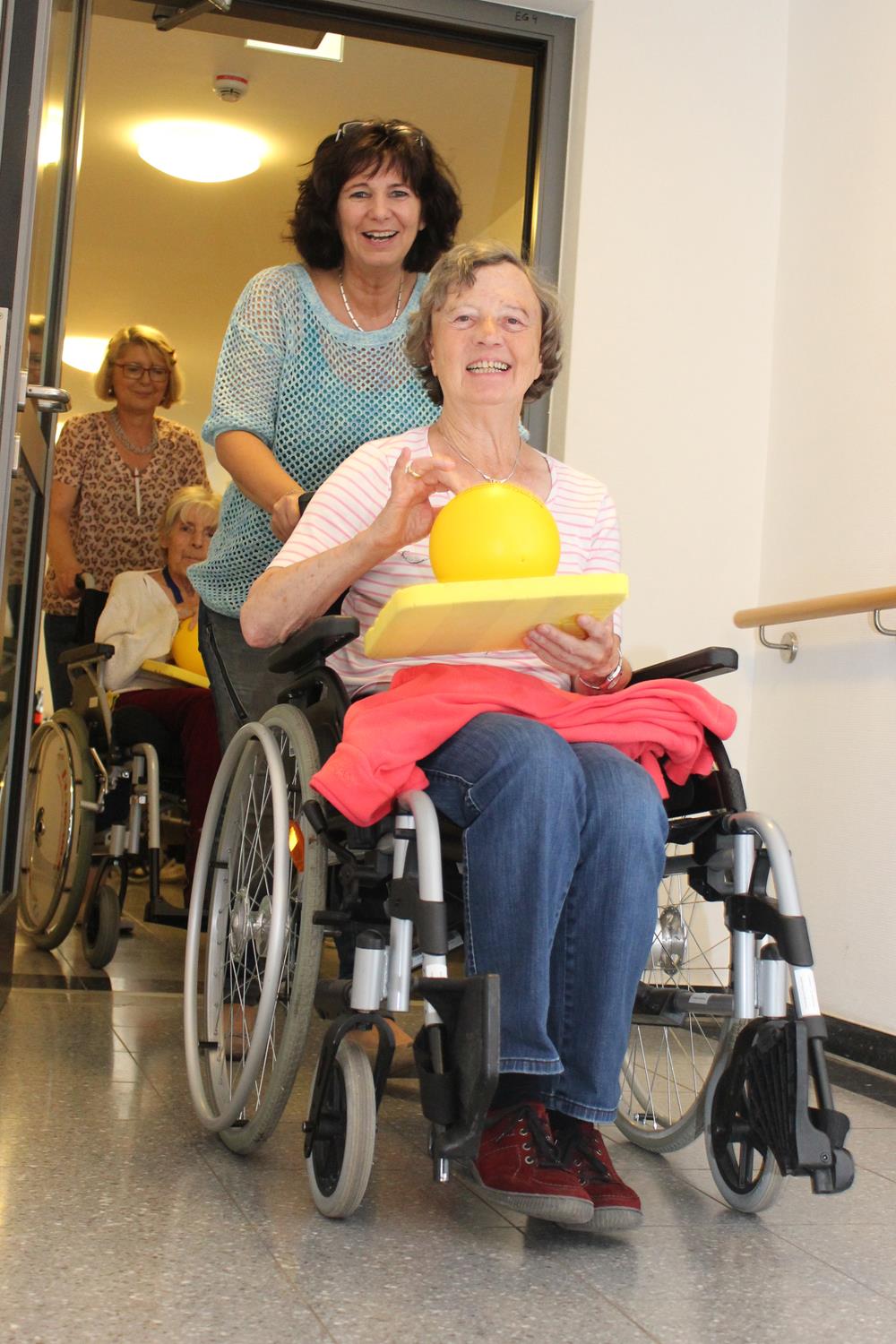 Diese Aktionen fanden an teilweise recht ungewöhnlichen Orten wie etwa im Verwaltungstrakt statt, in dem kurzerhand verschiedene Geräte aufgebaut wurden, mit denen die Bewohner ihre Geschicklichkeit unter Beweis stellen konnten. Und die hatten viel Freude an den Übungen. Auch die Wasch- und Reparaturstraße für Rollstühle und Rollatoren, die im Innenhof der Einrichtung errichtet wurde, stieß auf große Begeisterung. Von den rund 130 Bewohnern sind die meisten auf eine Geh-Hilfe oder einen Rollstuhl angewiesen, entsprechend voll wurde es im Hof. Mit den geputzten und generalüberholten Rollatoren und Rollstühlen ging es dann zur Schnitzeljagd, bei der die Bewohner in verschiedenen Gruppen teils knifflige Aufgaben lösen mussten.