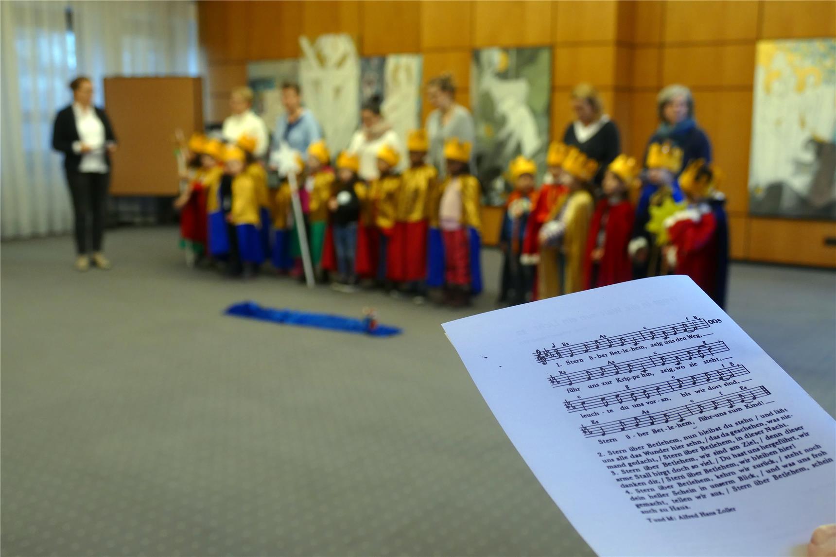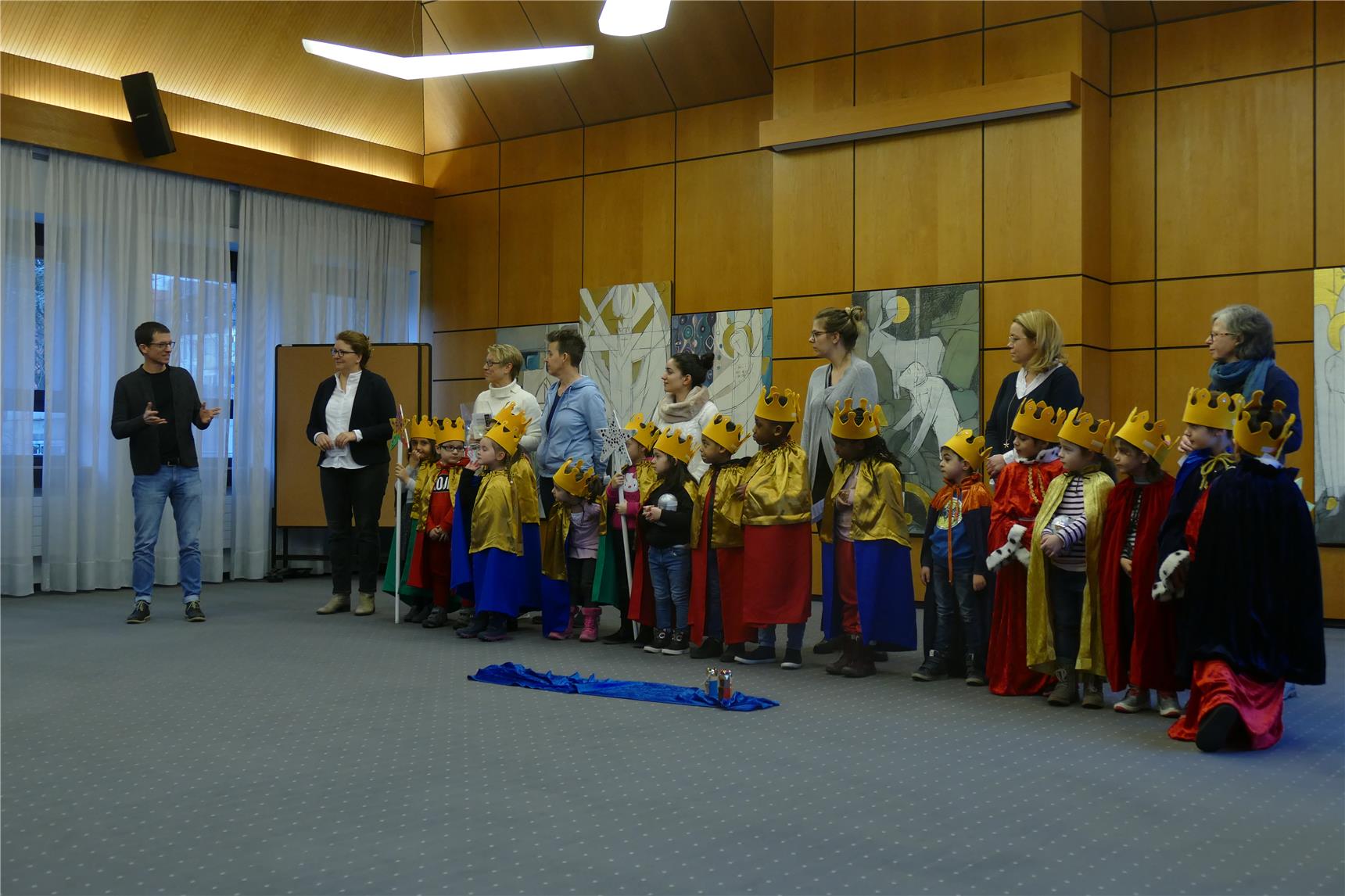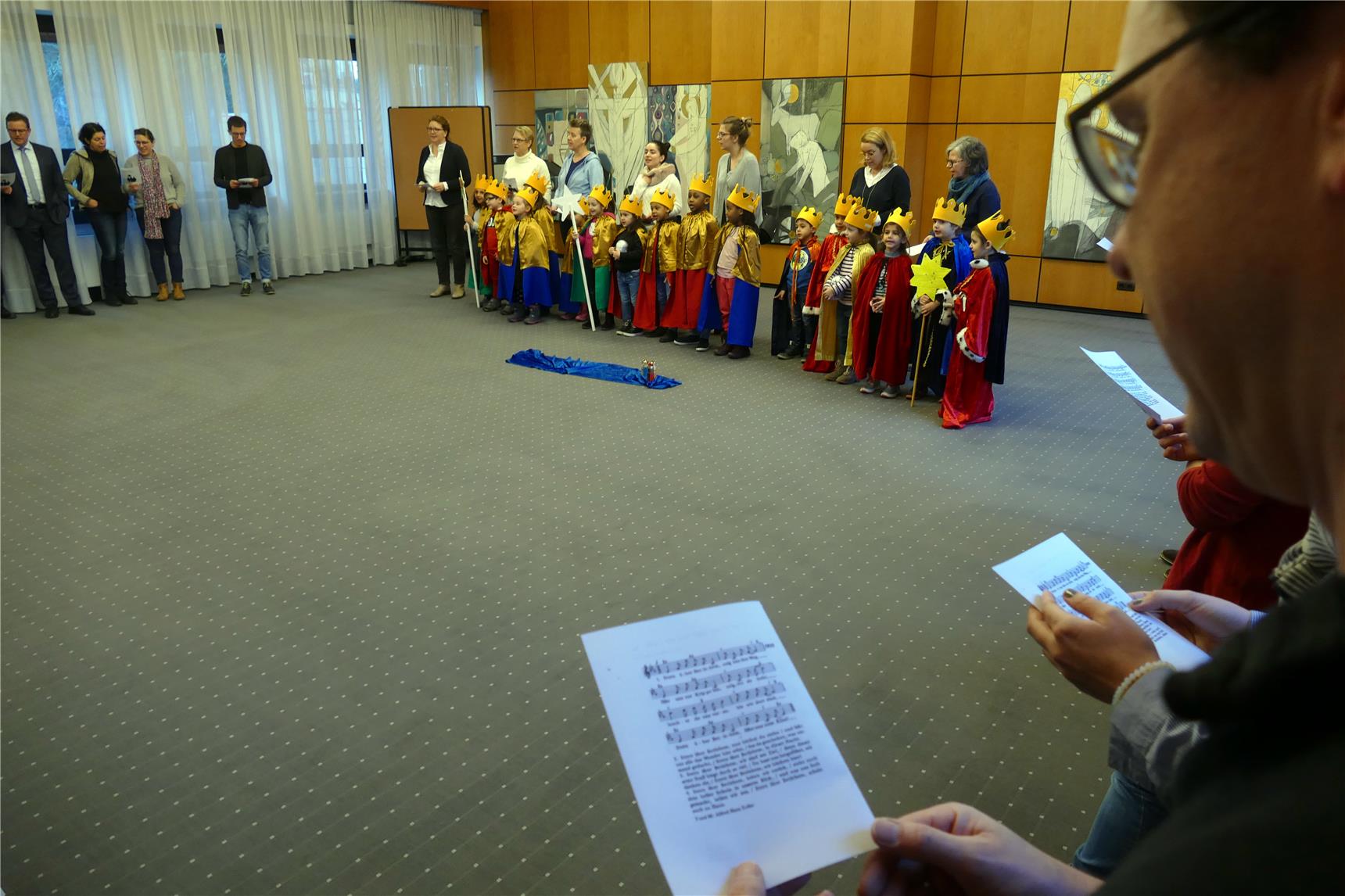 "Sing mit uns", lautete die Aufforderung der kleinen Sternsinger an die Mitarbeiterinnen und Mitarbeiter der Geschäftsstelle des Caritasverbandes für das Bistum Aachen, der Caritas Lebenswelten und des Rheinischen Vereins, die sich im großen Konferenzraum zur Begrüßung der Sternsinger eingefunden hatte. Dr. Mark Brülls zog bei der Begrüßung der Sternsinger eine Parallele zur Arbeit der Caritas. Er verwies auf die Inklusive Schule, die in Kürze im Partnerbistum Moshi in Tansania eröffnet wird. Dass es diese Schule gibt, sei auch ein Verdienst der Sternsinger. Denn sie hätten ebenso für den Bau der Schule gesammelt wie der Caritasverband für das Bistum Aachen und andere Caritasverbände.
