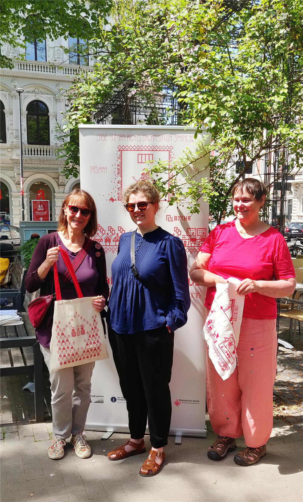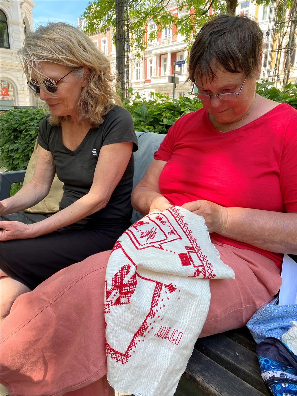 Wie ein roter Faden zieht sich durch die Stick-Ausstellungen und -Aktionen ein Motiv: traditionelle Kreuzstichtechniken aus Belarus, ausgeführt mit rotem Garn. Ob in der am Freitag, 13. Mai, eröffneten Ausstellung "Der Rote Faden" im Suermondt-Ludwig-Museum, in der Ausstellung "Der Rote Faden" am Freitag und Samstag, 27. und 28. Mai, in der Aula Carolina oder in den von Rufina Bazlova initiierten öffentlichen Stickaktionen "Framed in Belarus" in Aachen, alle haben eines gemeinsam: Die Frauenkunstwerkstatt Spectrum des Rheinischen Vereins, angeleitet von der Aachener Künstlerin Vera Sous, den Frauen des Sticktreffs Aachen und der Künstlerin Rufina Bazlova, die Künstlerin selber und Bürgerinnen und Bürger, die sich an Stickaktionen beteiligen, setzten den Protest der Bevölkerung in Belarus gegen das Unrechtsregime Lukaschenko mit Textilkunst in Szene. Teil dieses künstlerischen Protestes können alle werden, die sich an den öffentlichen Stickaktionen beteiligen und in Form eines Stickkunstwerks eine (Stick-) Patenschaft für eine politische Gefangene oder einen politischen Gefangenen in Belarus übernehmen. Die Stickaktionen haben am Samstag, 14 Mai begonnen, und enden am 27. Mai. Am 28. und 29. Mai werden diese Kunstwerke dann in der Aula Carolina gezeigt, gemeinsam mit der Installation der Frauenkunstwerkstatt Spectrum des Rheinischen Vereins: drei rot bestickten, weißen Kleidern schwebend vor einem riesigen Bildteppich als Symbol des Widerstands. Diese Ausstellung werden die Aachener Oberbürgermeisterin Sibylle Keupen und Stephan Jentgens, Diözesancaritasdirektor im Bistum Aachen, gemeinsam eröffnen. Finanziell unterstützt wird die Kunstaktion von der Caritas-Gemeinschaftsstiftung im Bistum Aachen.